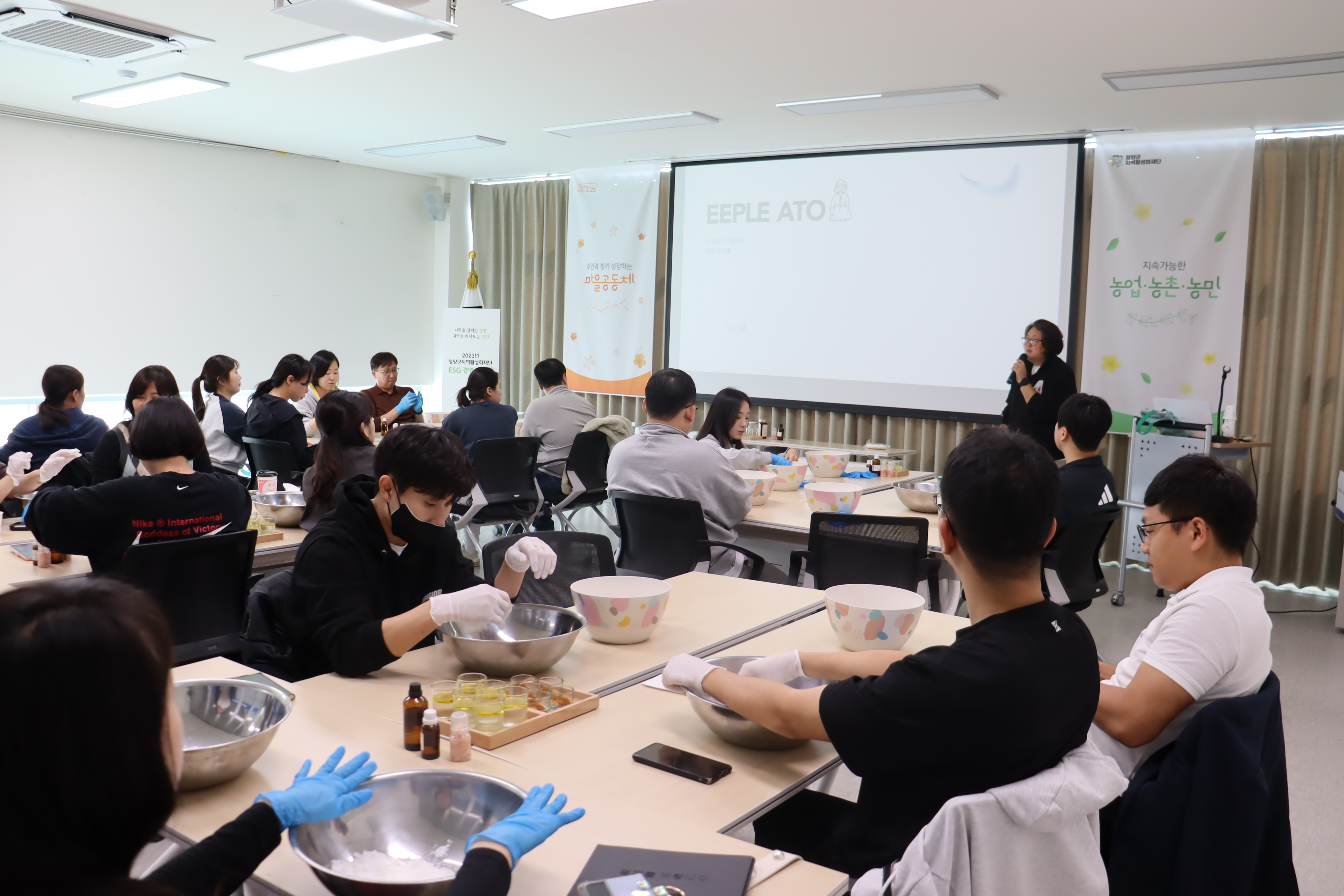 ✤ 이어진 시간으로는 이플아토 허지혜 대표가 비건 농산물 비누 만들기 프로그램을 운영하였다. 직원들이 직접 농산물 비누를 만들어보며 환경 보호의 중요성에 대한 경각심을 가지는 시간을 가졌다.