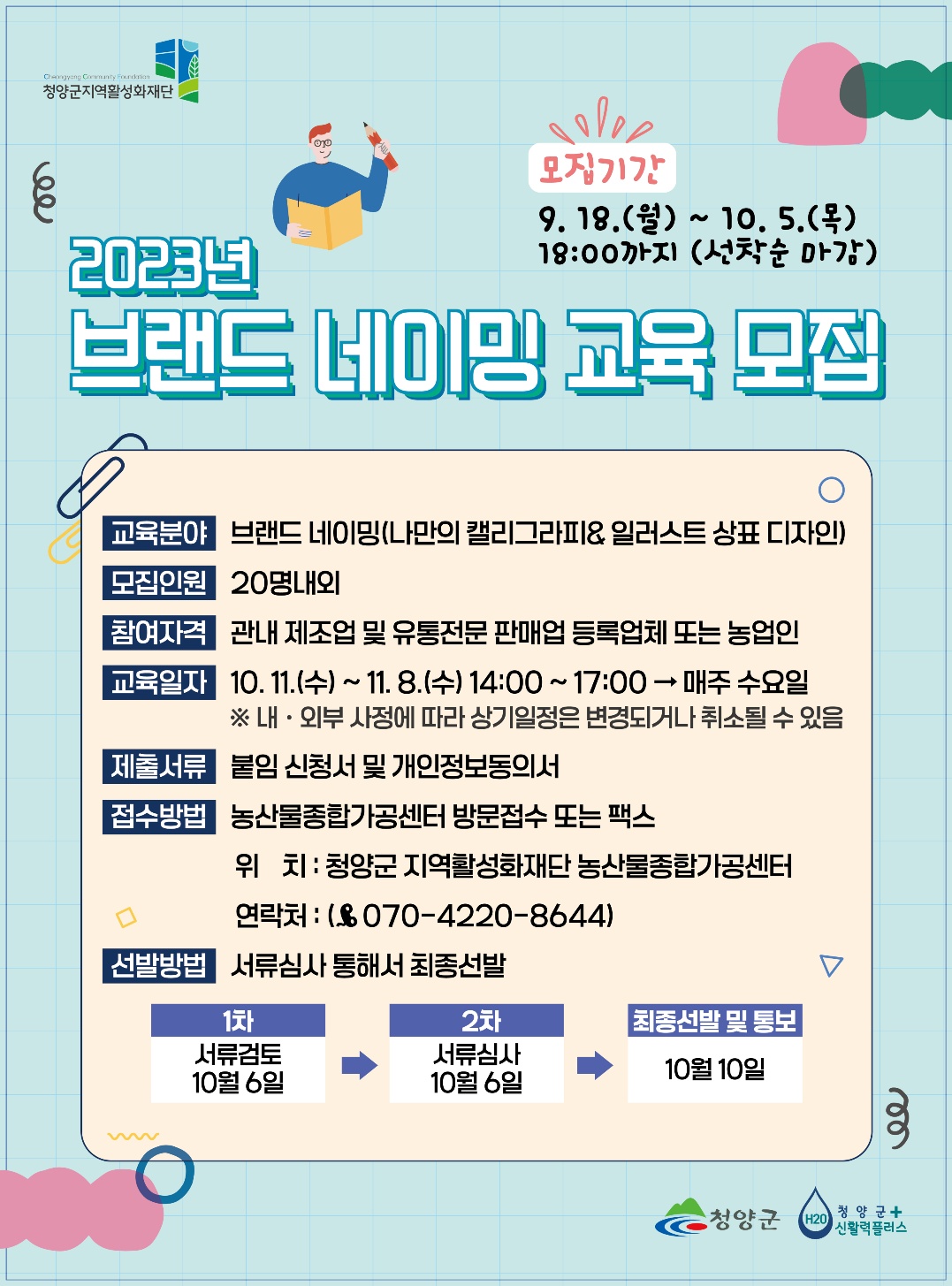 ✤ 청양군지역활성화재단(이사장 이종필 부군수, 이하 “재단”)은 다양한 로고 및 일러스트를 디자인하여 나만의 브랜드 네임을 확보하고자 2023년 9월 18일부터 청양군민을 대상으로 브랜드 네이밍 교육 수강생을 모집한다.