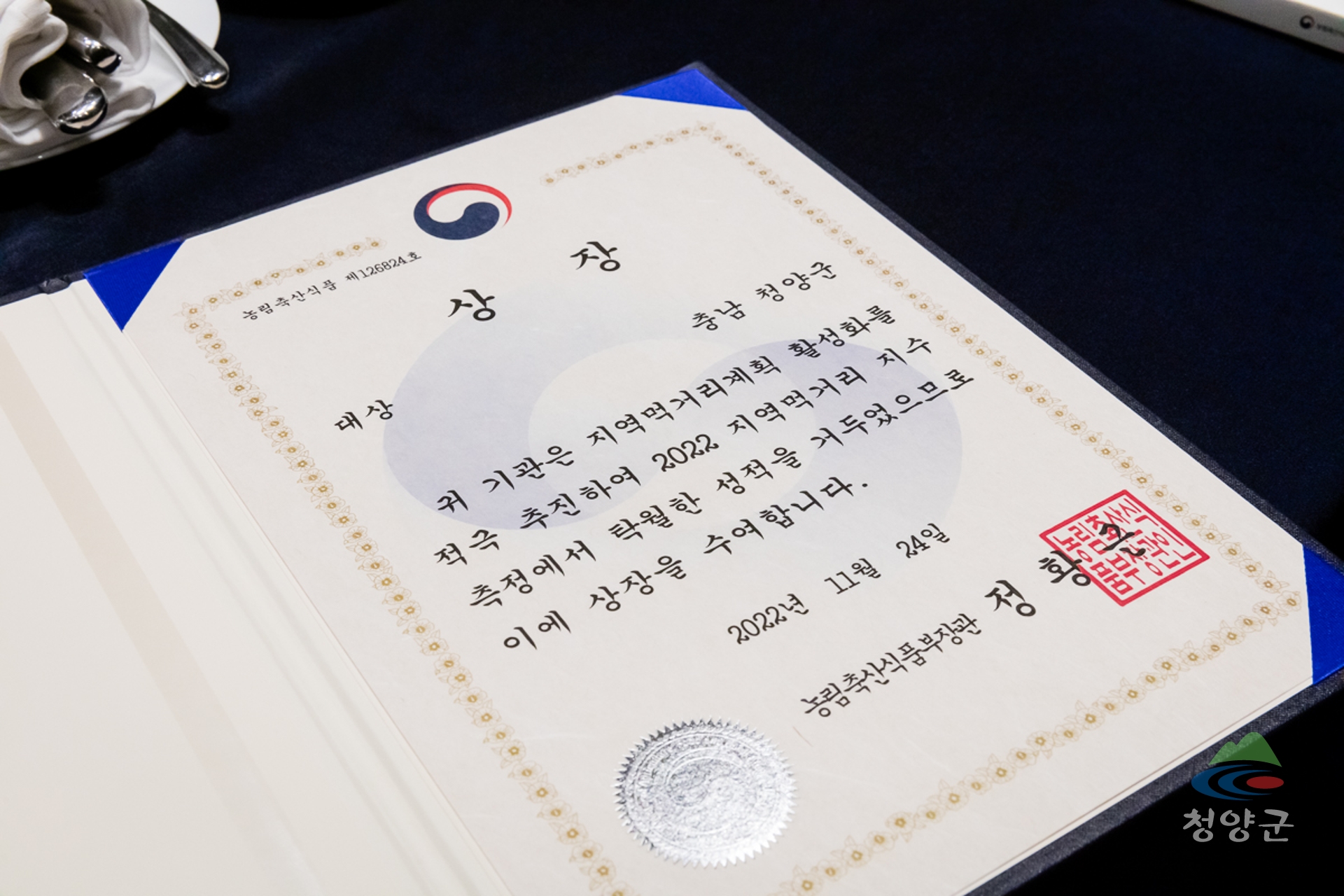 청양군 2022년 지역먹거리 지수 평가 대상(S등급) 수상